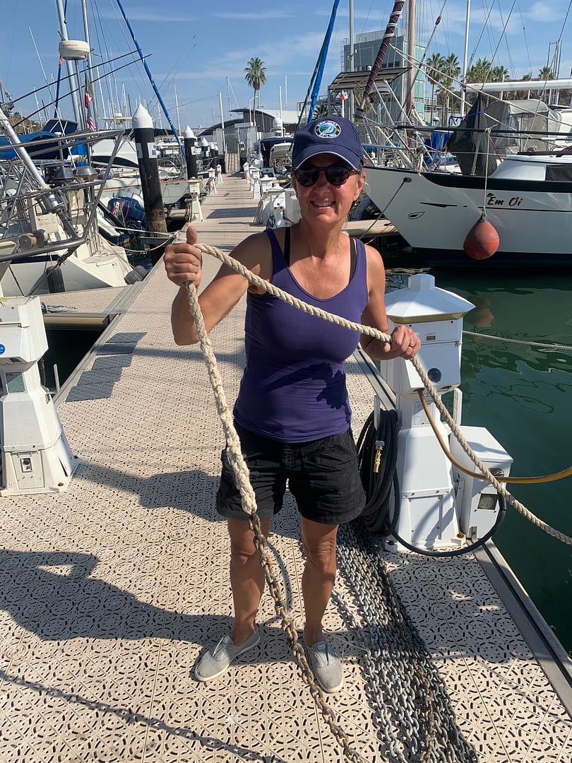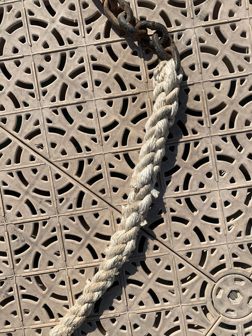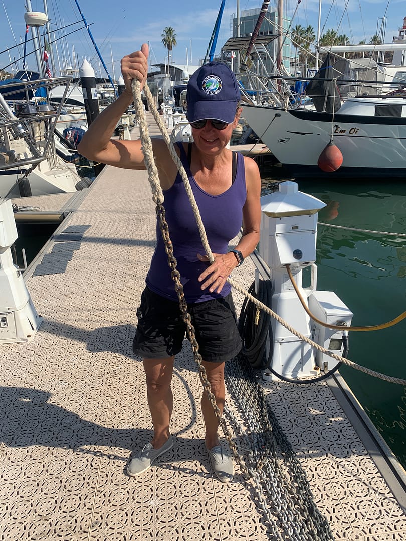 This was a perfect opportunity to flip the anchor chain, inspect it, mark it, and splice it back to the 10 feet of three-braid nylon anchor rode (rope) that secures the anchor rode it to the anchor locker. This rope also facilitates a quick cutaway in an emergency. YouTube proved invaluable for learning how to splice the rope to the chain. The nylon rode connects at one end to our 300 feet of galvanized chain and at the other end to an eyebolt inside the chain locker. Flipping the chain allows for a thorough inspection of the full length of the chain for excessive wear. By simply detaching the anchor at one end of the chain and the rope at the other end, and switching them around, we can ensure more even wear on the chain.