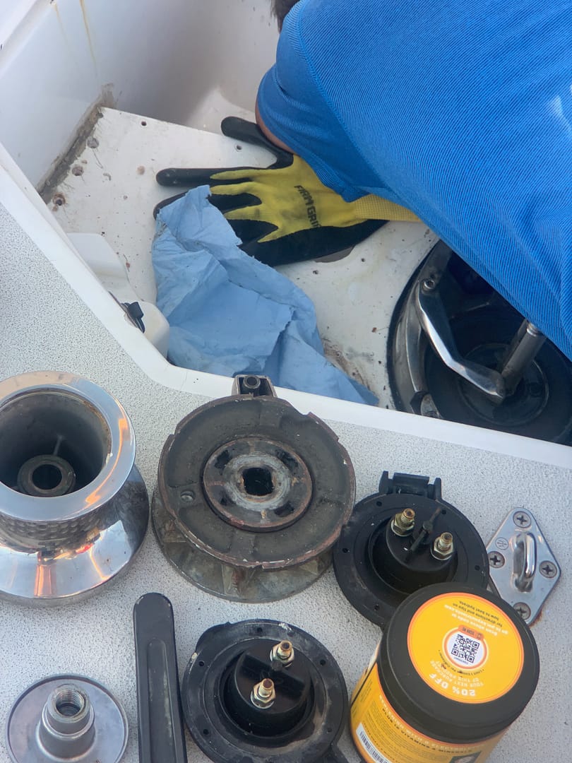 The windlass failure underscored the importance of reviewing our maintenance log to identify any equipment due for routine maintenance or service. The winches stood out as requiring attention. It’s recommended that winches be serviced annually and it doesn’t appear it has been done for quite some time. Once the chain was secured back in the chain locker, I turned my attention to servicing all six manual winches. On a sailboat, winches are mechanical drums that help control the lines and sheets (ropes) attached to the sails. They provide mechanical leverage when hoisting, trimming, and pulling in ropes that would otherwise be unmanageable on a 45-foot sailboat.