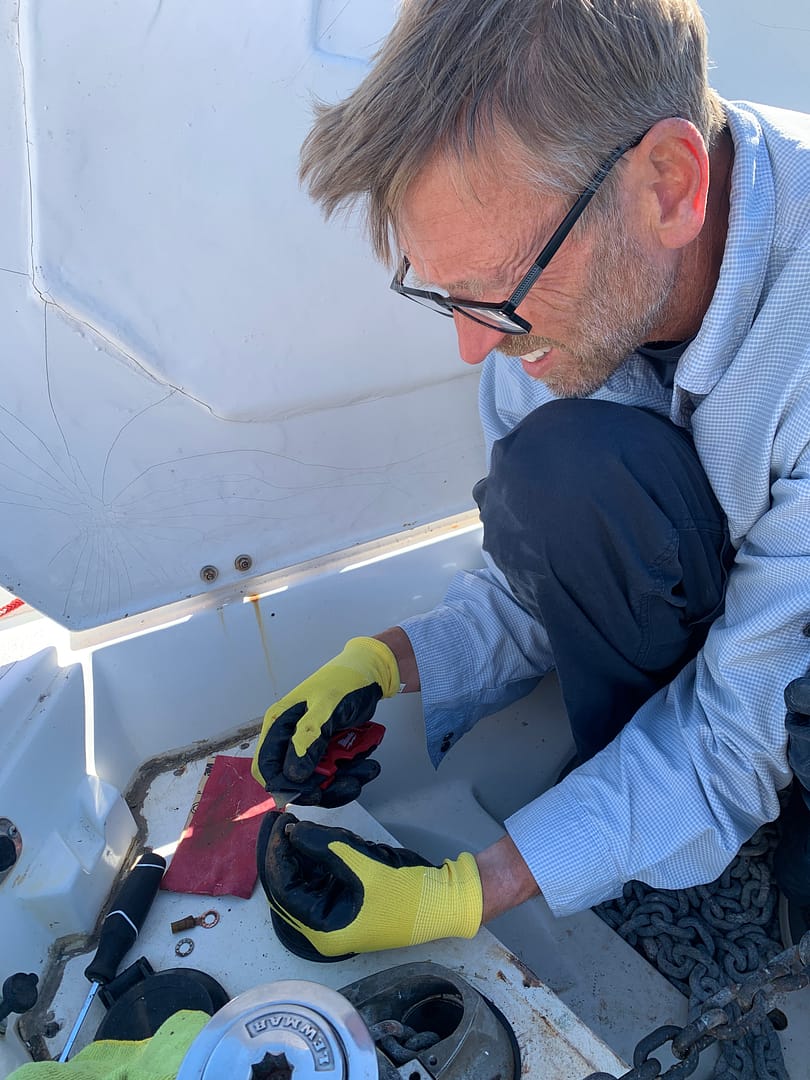 Tyler undertook the arduous task of removing the windlass motor from the underside of the mounting bracket inside the chain locker, which required him to work in a contorted, nearly upside-down position for hours. He replaced it with a new motor ordered from Lewmar UK, which we picked up in Tucson, Arizona, and brought back to Guaymas. Our marine electrician sourced the correct gauge marine wire and other necessary parts locally to replace the damaged welding wire once Tyler installed the motor. While Tyler labored over the windlass project and we awaited Jesús’s return to handle the wiring, I focused on a couple of other projects.