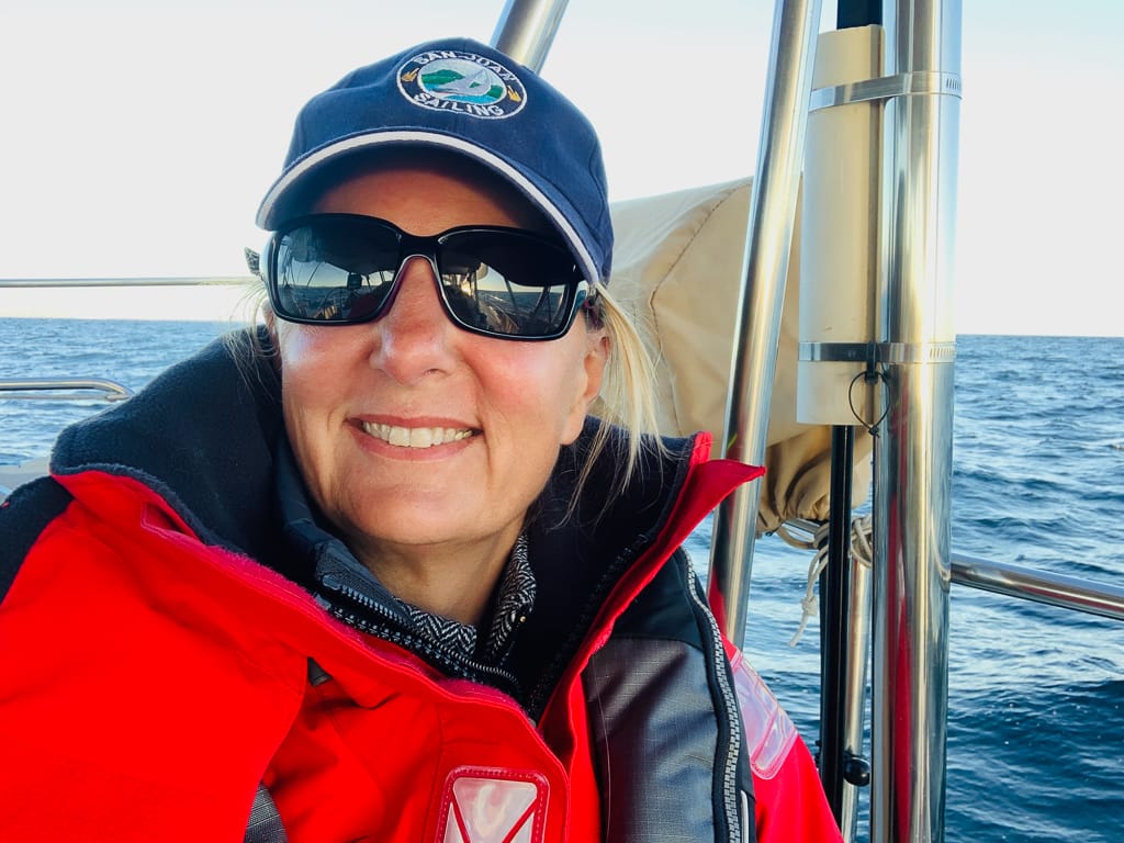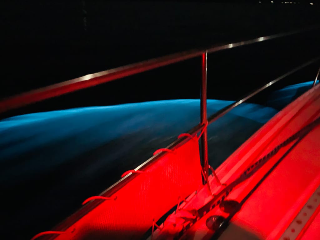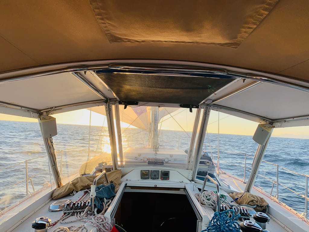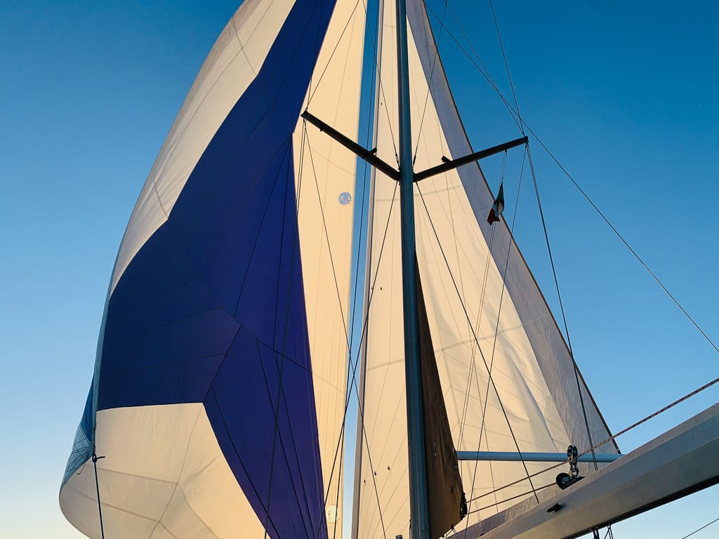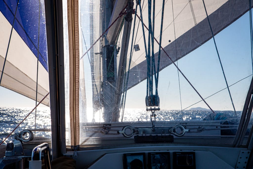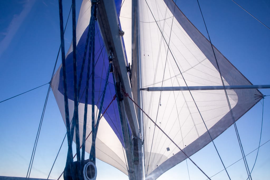 It took him about thirty tense minutes to sort out the mess and make his way back to the cockpit with the bow seat in hand. A repair for another time. Despite the difficulties, Tyler was determined to try again. Although I was nervous, I trusted his judgment. With careful coordination, he pulled the furling line and released the Reacher sheet, successfully deploying the sail this time. Then, he unfurled the Genoa onto the pre-rigged whisker pole, and just like that, we were under sail.
