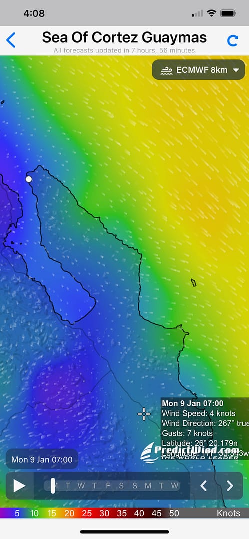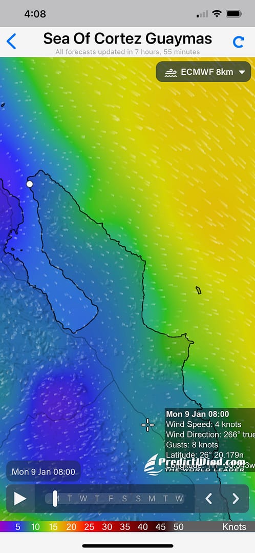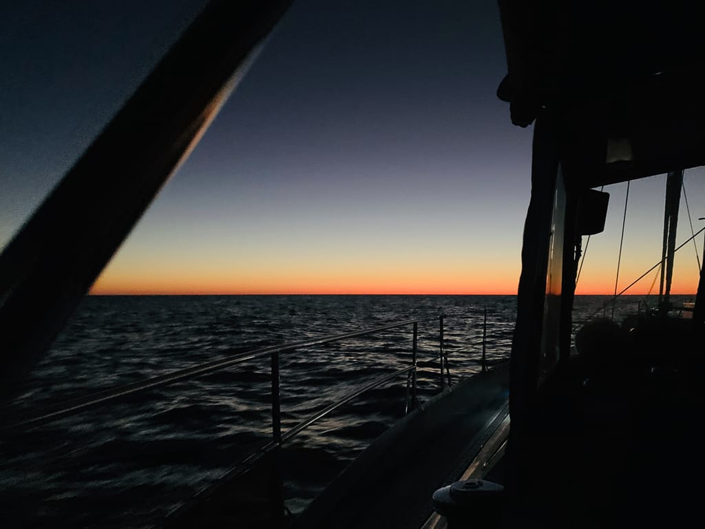 The journey from San Domingo to San Juanico was the epitome of perfect downwind sailing. Our day began early, at 5 a.m., before the first light of dawn. As we motored out of the anchorage, our path was illuminated by the brilliant bioluminescence trailing in our wake. A waning gibbous moon hung overhead, and the sky was filled with stars, guiding us through the darkness. The gentle lapping of the waves against the hull created a peaceful rhythm, while the cool morning breeze promised perfect sailing conditions. As the sun slowly rose, the horizon came alive with hues of orange and pink, casting a magical glow across the sea. Dolphins appeared sporadically, playfully riding alongside us, adding a touch of magic to the serene morning.
