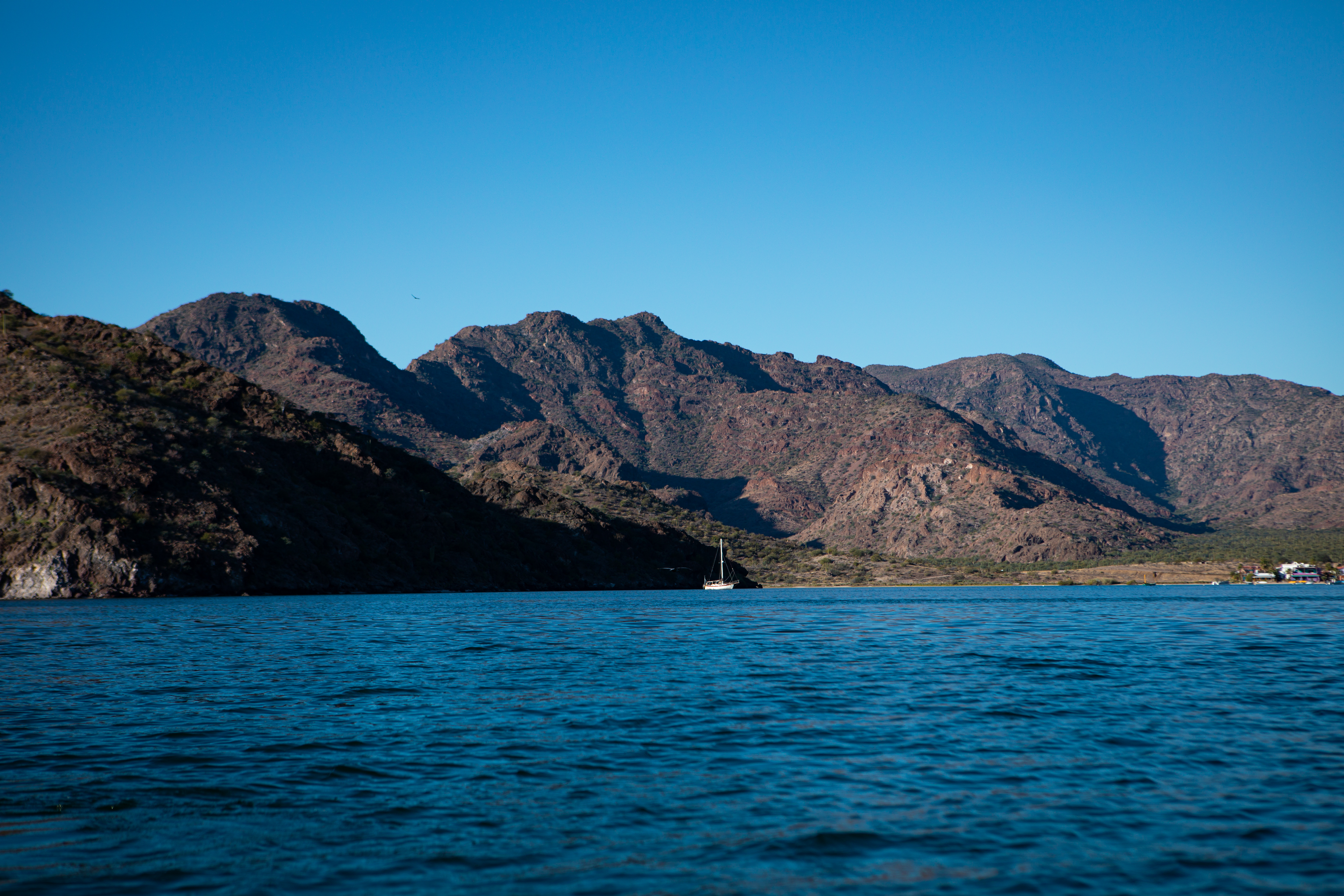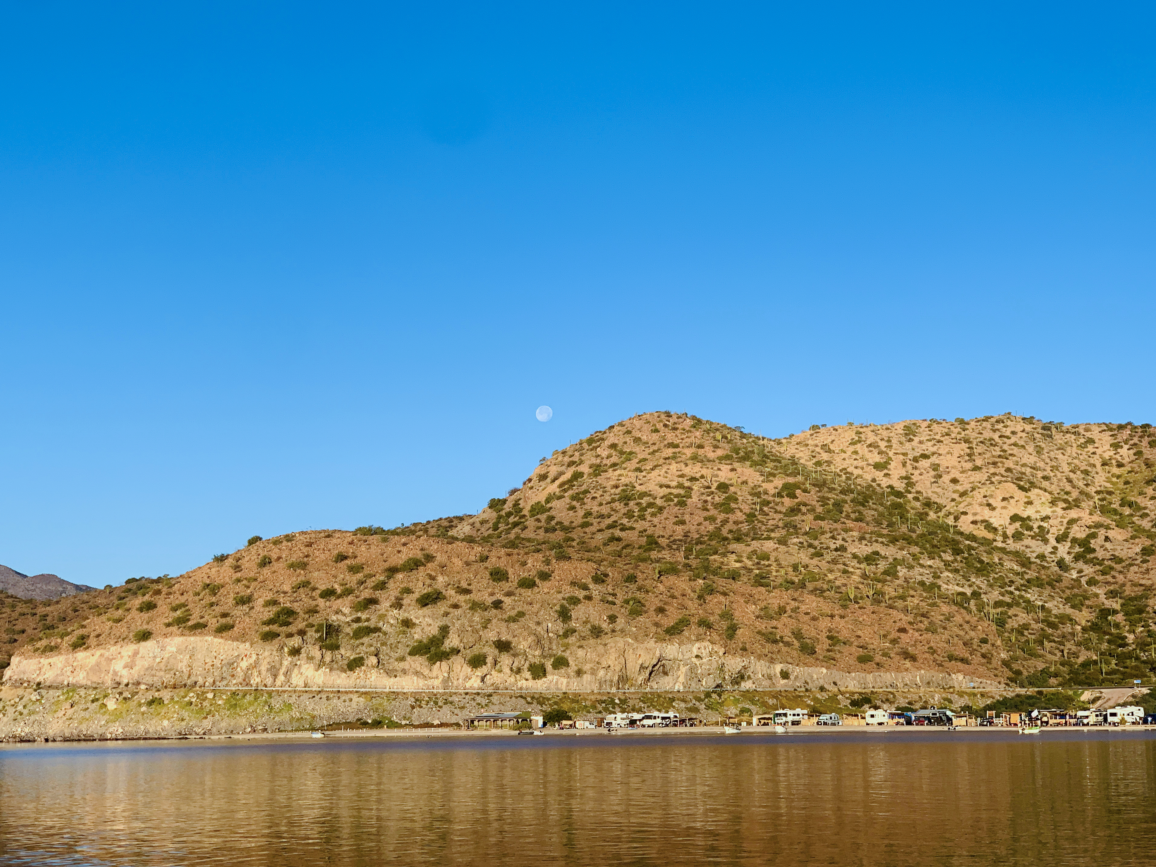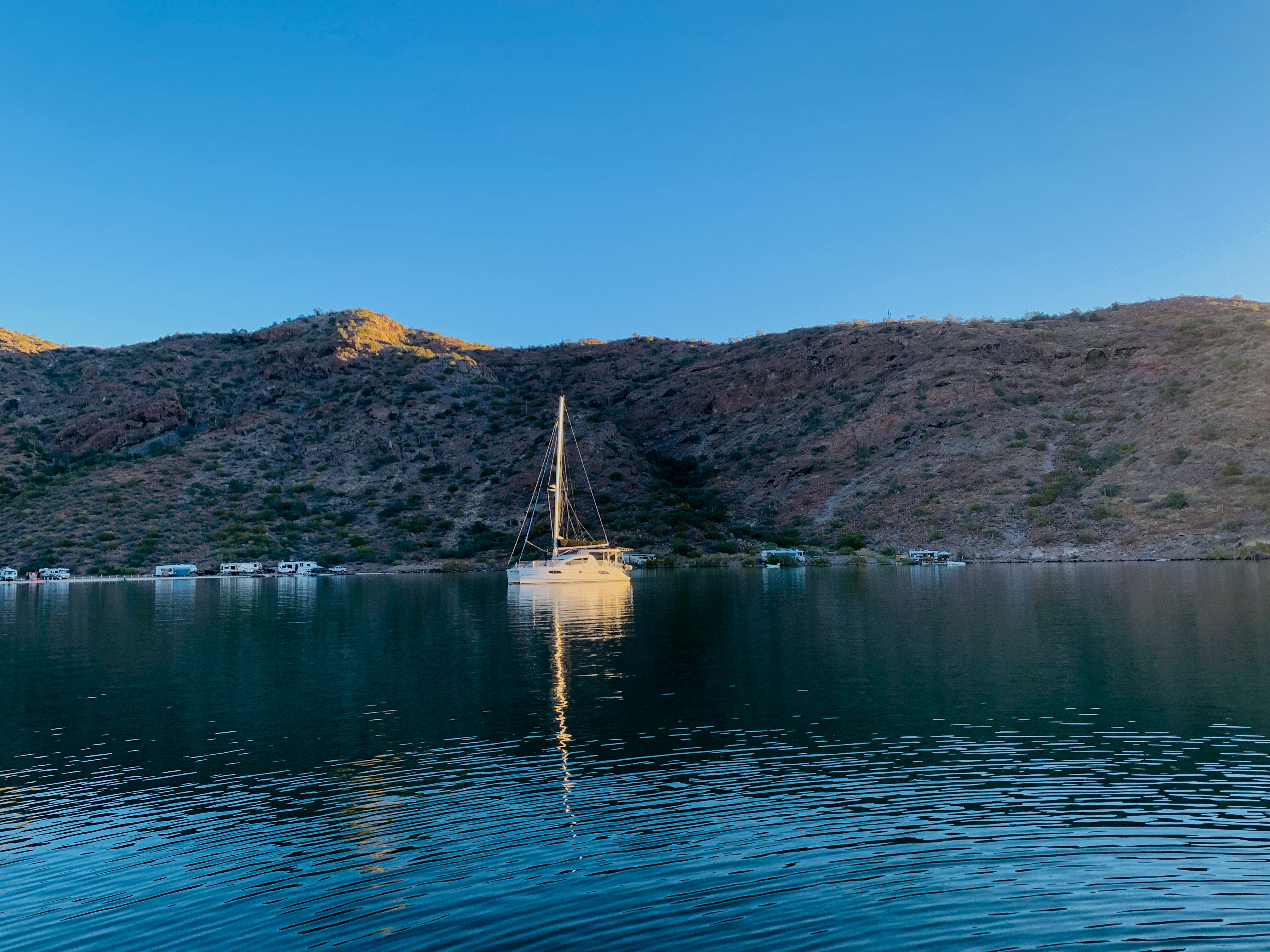 As we anchored at Santispac, we were greeted by the sight of recreational vehicles lined up along the shore, their occupants having journeyed from the United States and Canada. These RVs are positioned to take full advantage of the breathtaking views of Bahia Concepcion, offering their occupants a front-row seat to the bay’s magnificence. The striking contrast between the arid, dusty desert landscape and the vibrant blue waters is nothing short of spectacular. It’s a view that defies description; no photograph could truly capture the scene’s vividness and the peace it instills.