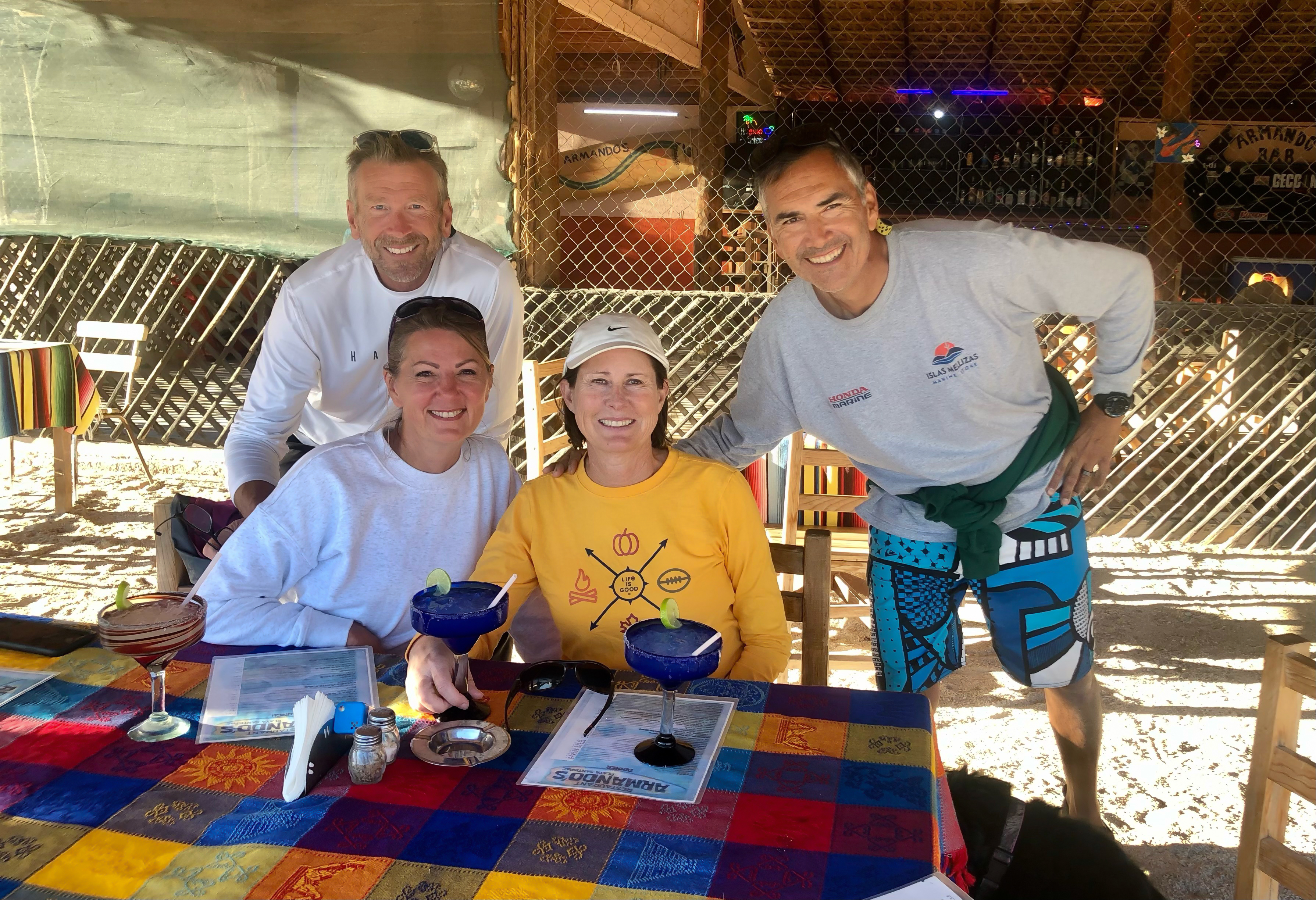 However, low tide presented its challenges. When we decided to head ashore for dinner with our friends Ed and Finese at Armond’s, one of the palapas, we had to navigate a sandy shoal. Pulling our dinghy through knee-deep water for about 20 yards became a shared adventure, turning a simple meal out into a memorable part of the day’s journey.
