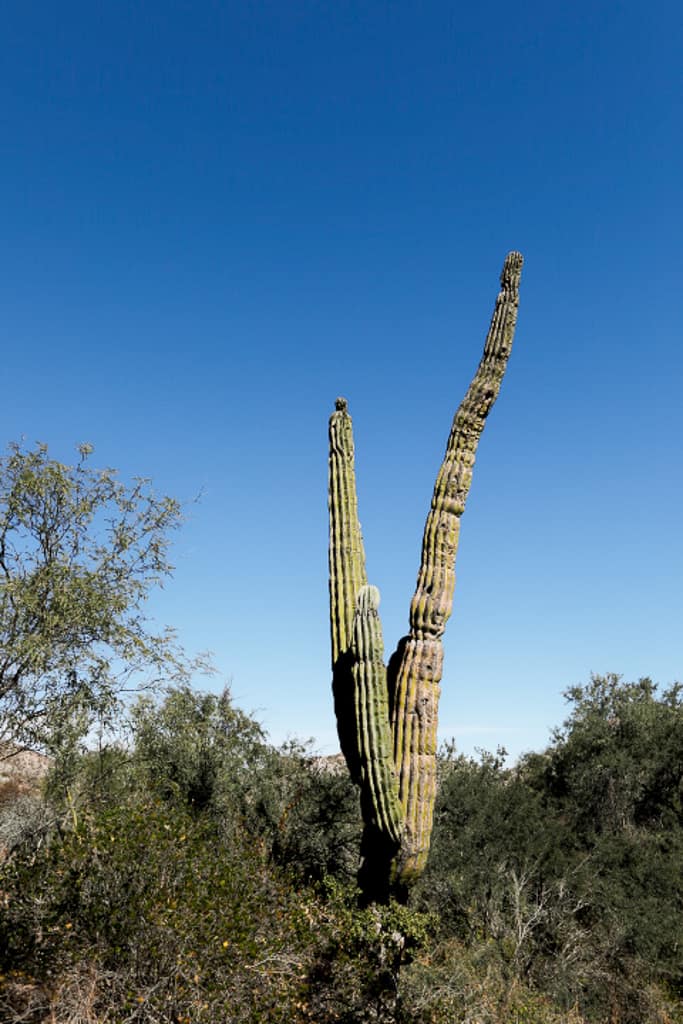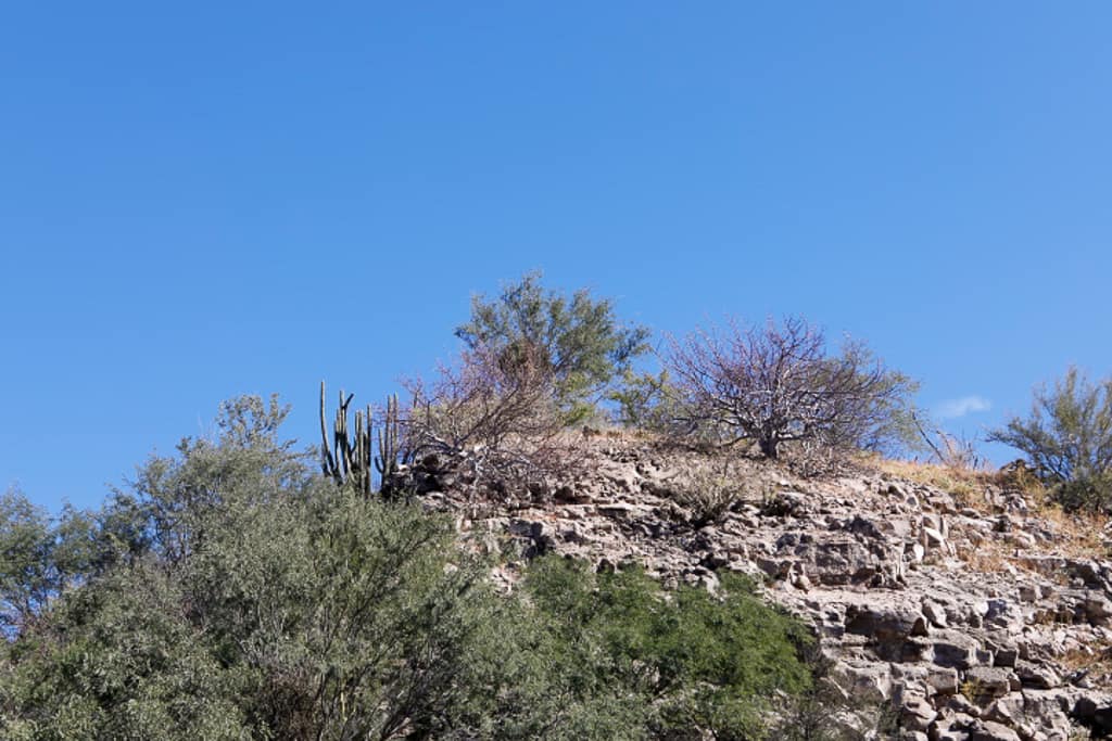 The hike to the goat farm was an adventure in itself. The hillside was crisscrossed with dirt paths that wound through a dessert landscape of peppered with dry grass, native brush, succulents, and towering cactus trees. After a few wrong turns, we finally found the right trail. The day was warming up, so we shed our jackets as we trekked along the dusty path. Eventually, we arrived at the elusive goat farm, only to find it deserted. The farm itself was modest—a simple wooden structure enclosed by a low, wire fence supported by old wooden posts. A few dogs greeted us, barking at the sight of unfamiliar visitors. Disappointed but undeterred, we turned back the way we came to explore the beach where we landed our dinghy.