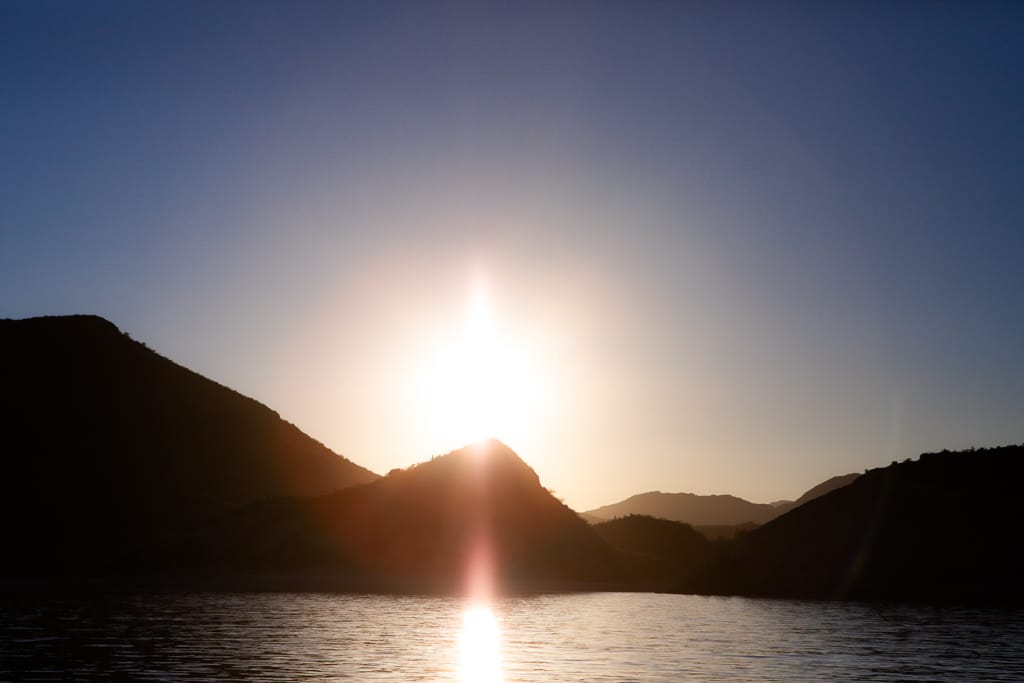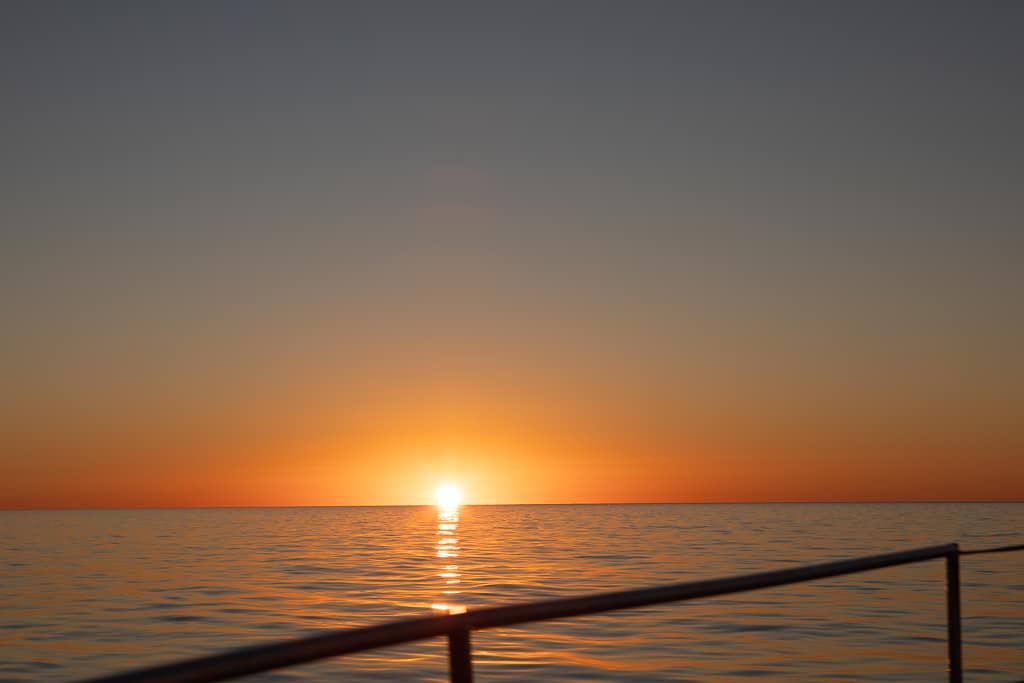 The evening light glimmered on the water, and to our surprise, a group of Mobius rays began to leap from the sea, creating a mesmerizing display. Their numbers were impressive, though they eluded my camera. If only they would jump on cue! Still, the experience was one we wouldn’t forget.